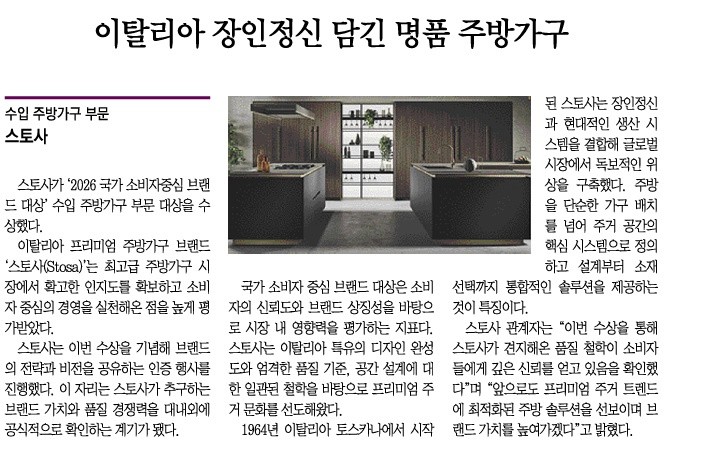 1964년 이래, 스토사는 이탈리아 디자인의 본질과 장인정신을 지켜오며 완성도 높은 주방을 선보여 왔습니다. 공간을 깊이 이해하는 설계와 소재, 균형 잡힌 마감을 통해 주방은 더욱 정제된 아름다움과 지속 가능한 가치를 갖게 됩니다. 스토사는 선택에 대한 확신이 되는 주방을 제안합니다.