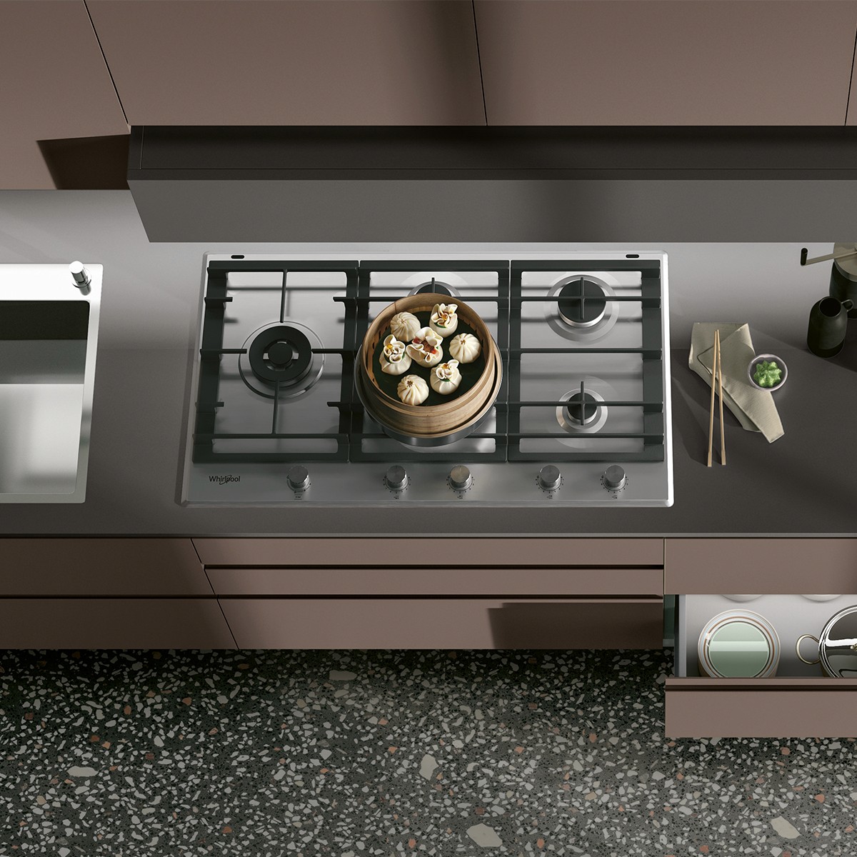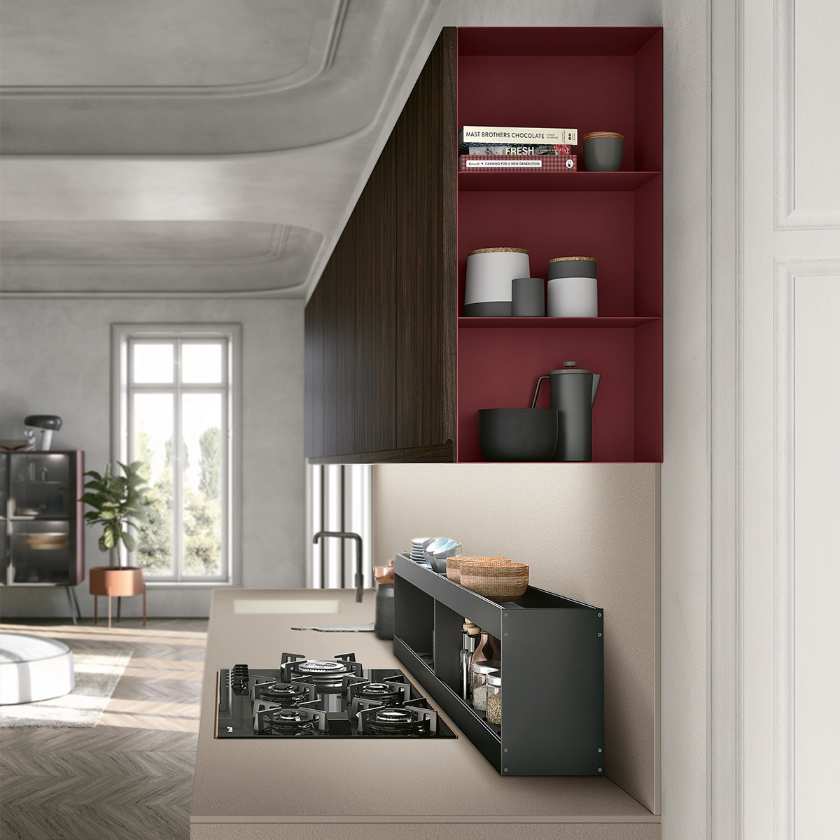 The elements that characterise Karma give a dynamic feel to kitchen compositions, and guarantee a visually balanced and cohesive style that embodies intelligent living solutions. Available with drawers of different sizes (12, 24 and 36 cm), Karma allows the designer to experiment with alternating volumes and clean lines to create a more compact kitchen.