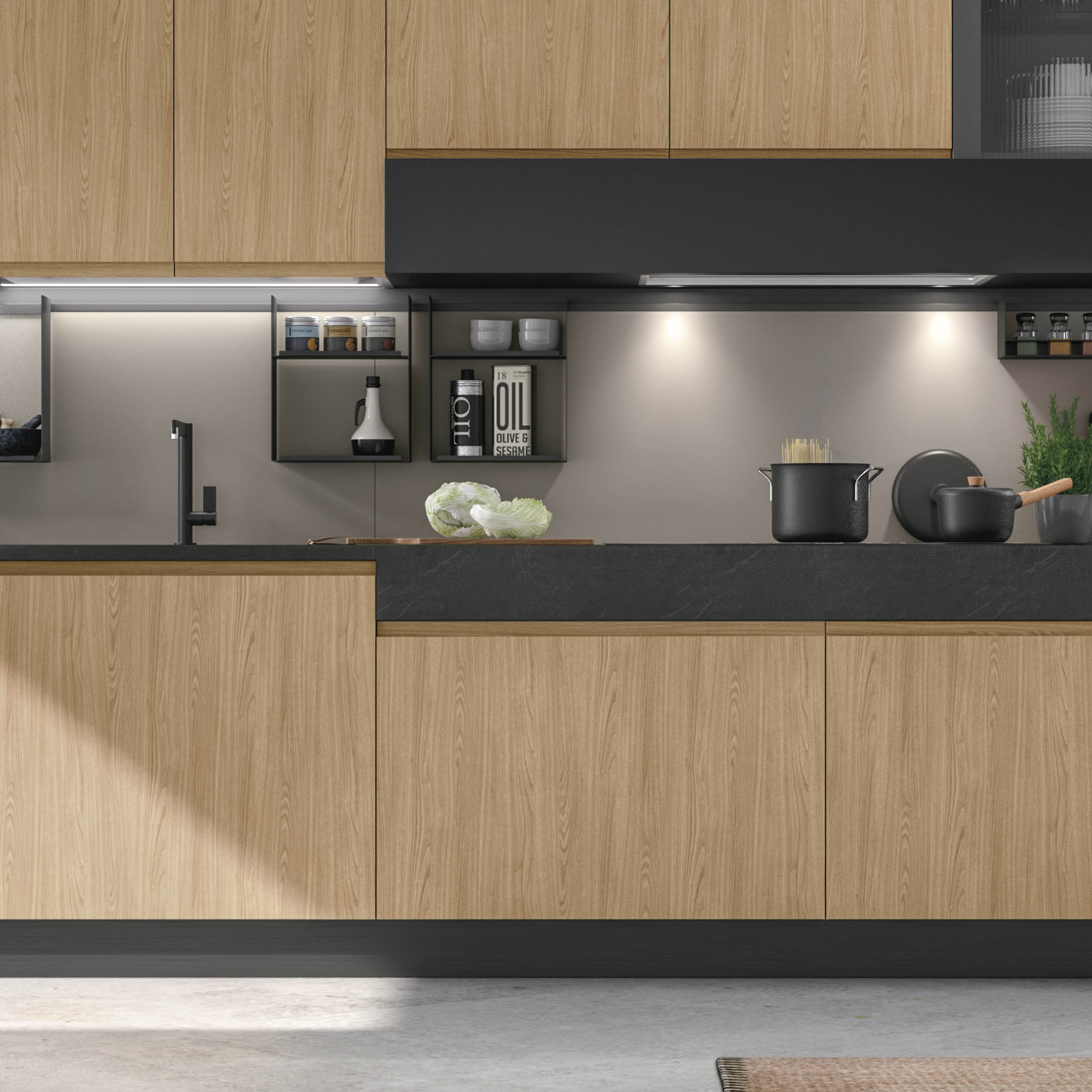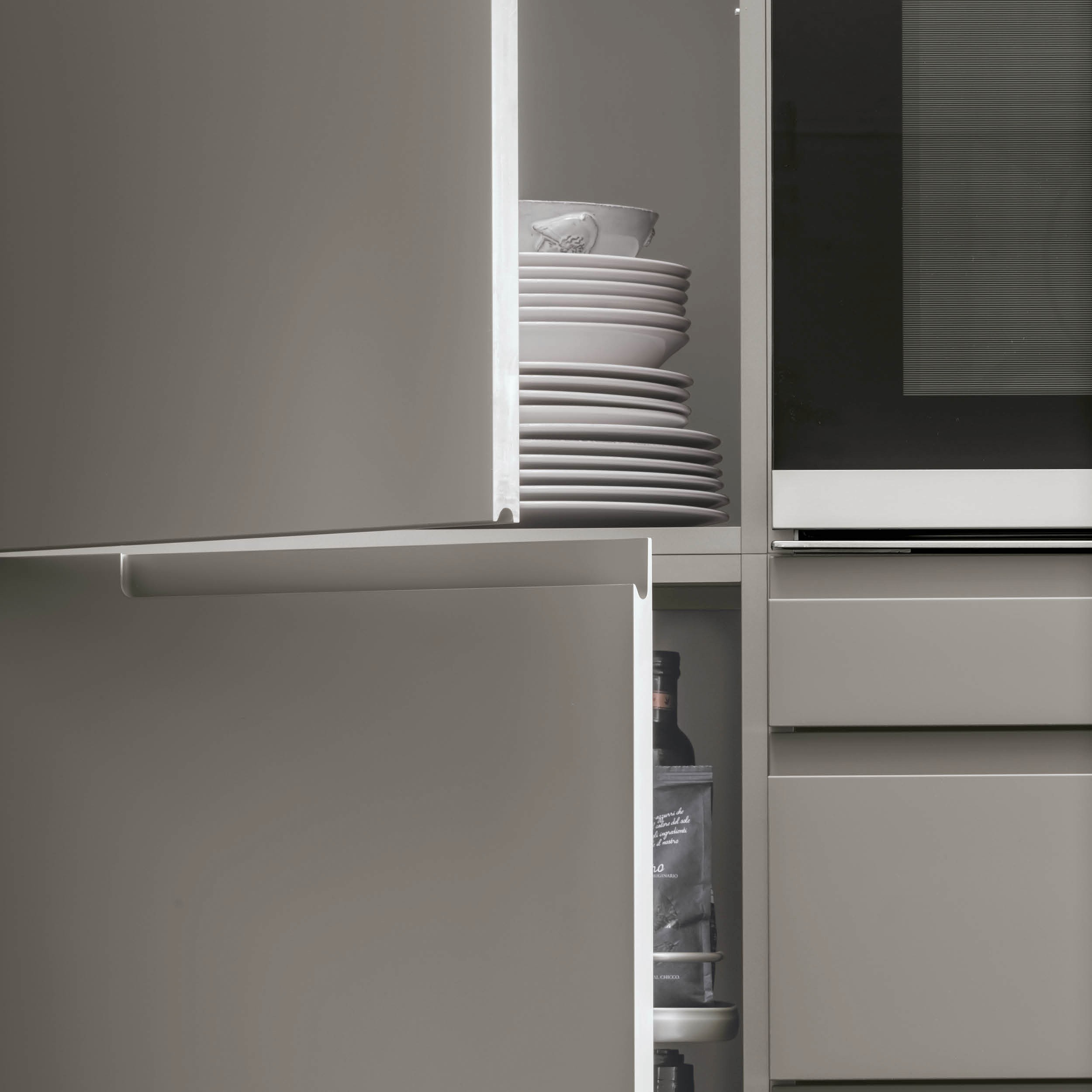 Designed for customers who love clean lines, and to bring out the best in contrasting materials and colours, Karma stands out for its doors with integrated handle and for three types of opening mechanism that define and decorate the kitchen: full length handle, partial length handle, counter-grip handle – details that create an original look and guarantee maximum functionality.
