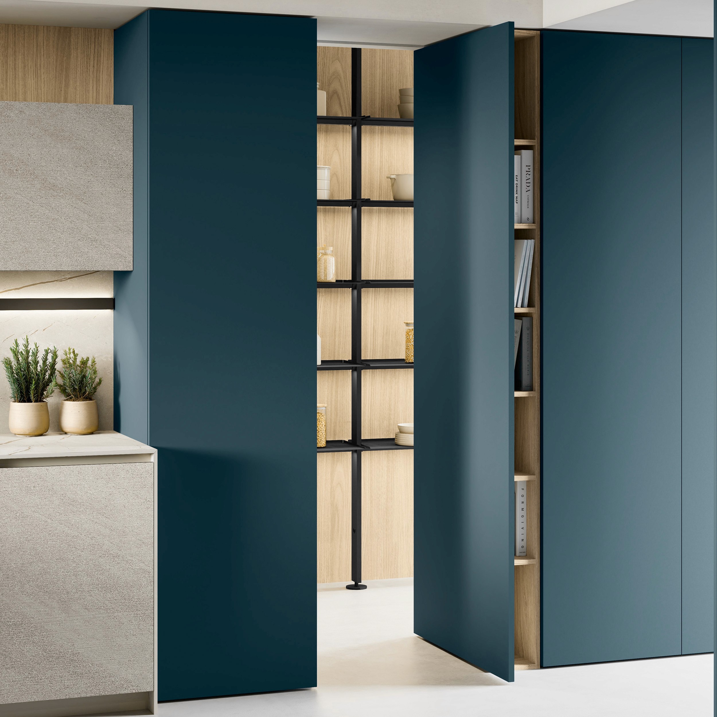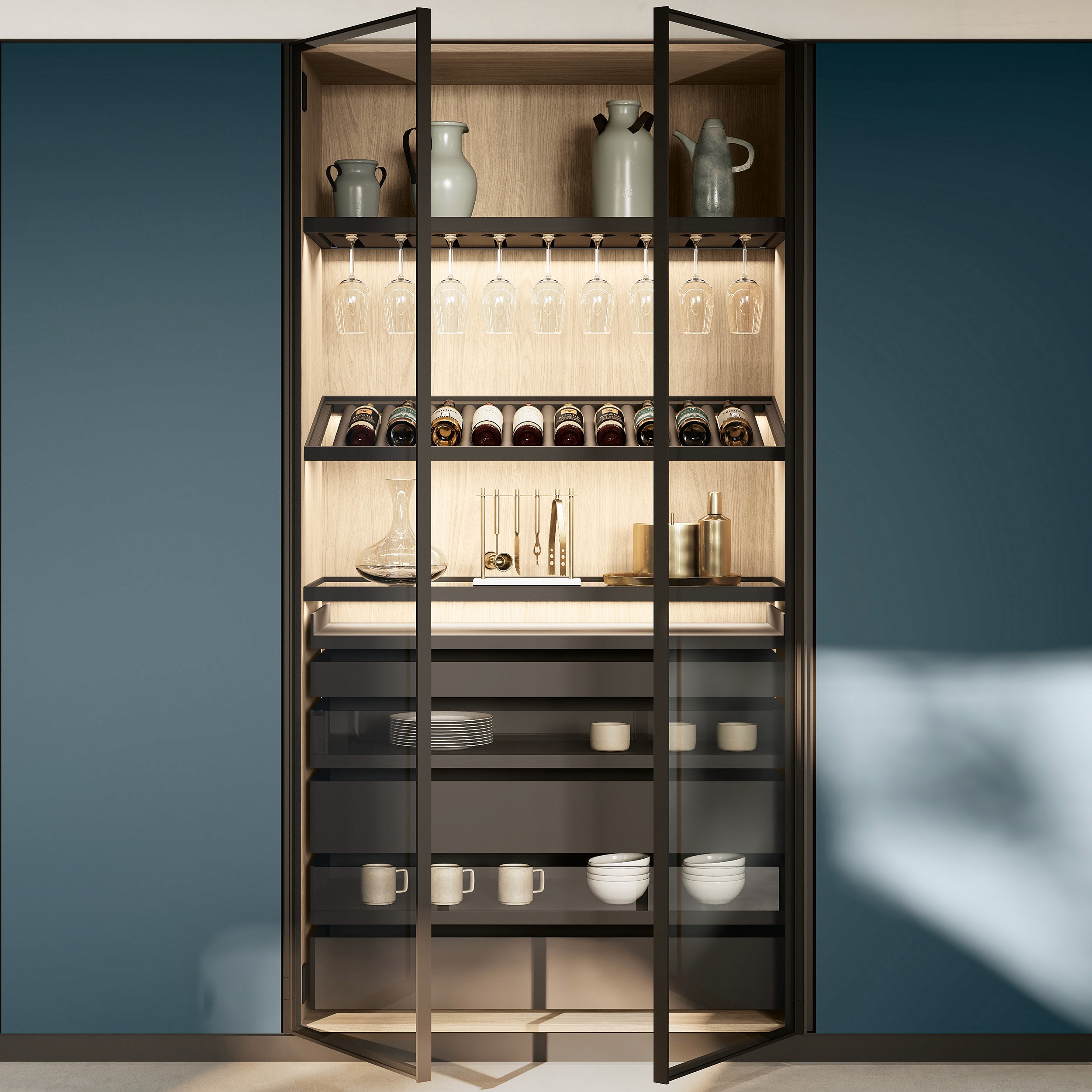 Metropolis has well organised storage spaces, which are also available in 75 cm widths to hold latest-generation white goods such as XXL refrigerators and ovens, and units divided into three drawers of different heights (12 / 24 / 36 cm) highlighted by contrasting grooves.